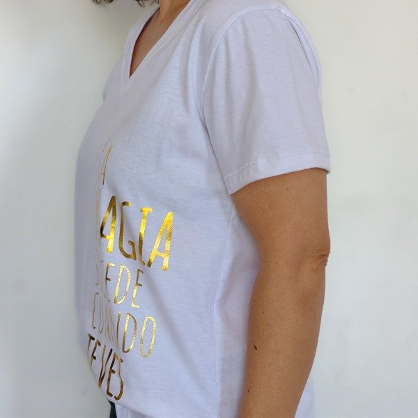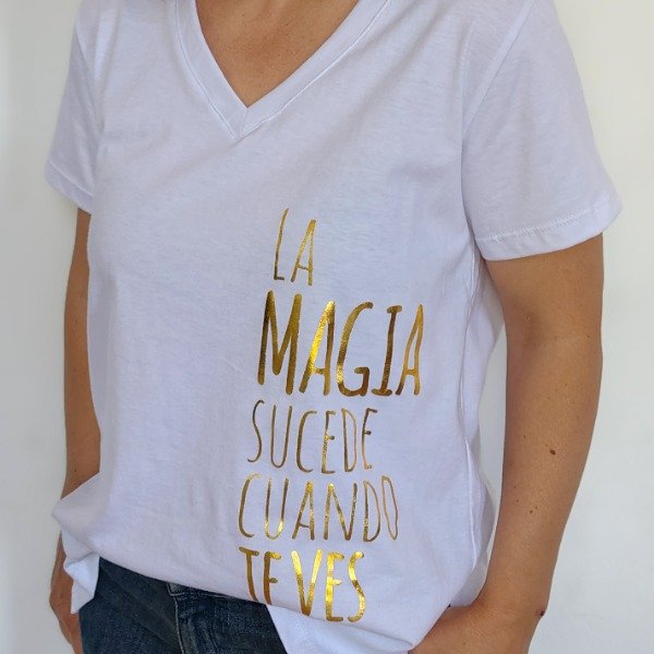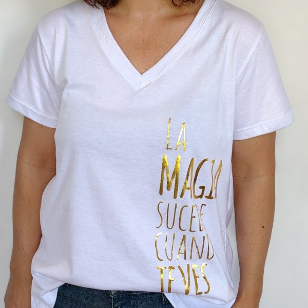REMERA ESCOTE V BLANCO ESTAMPADA EN DTF DORADO, EN TALLES DEL S AL 3XL