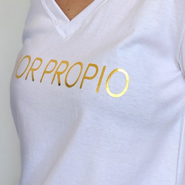 REMERA ESCOTE V BLANCO ESTAMPADA EN DTF DORADO, EN TALLES DEL S AL 3XL