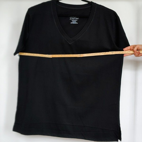 Tiene 67cm de ancho o se torax, es escote V no muy profundo para que estes comoda.